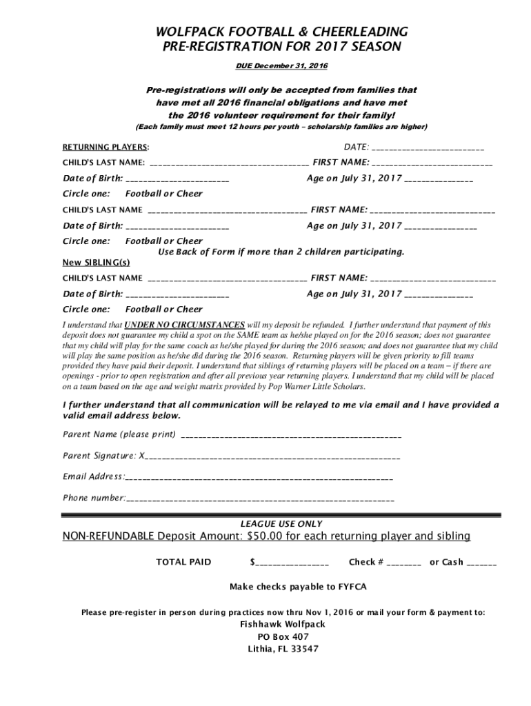 WOLFPACK FOOTBALL & CHEERLEADING PREREGISTRATION FOR 2017 SEASON DUE December 31, 2016Preregistrations will only be accepted from families that have met all 2016 financial obligations and have met