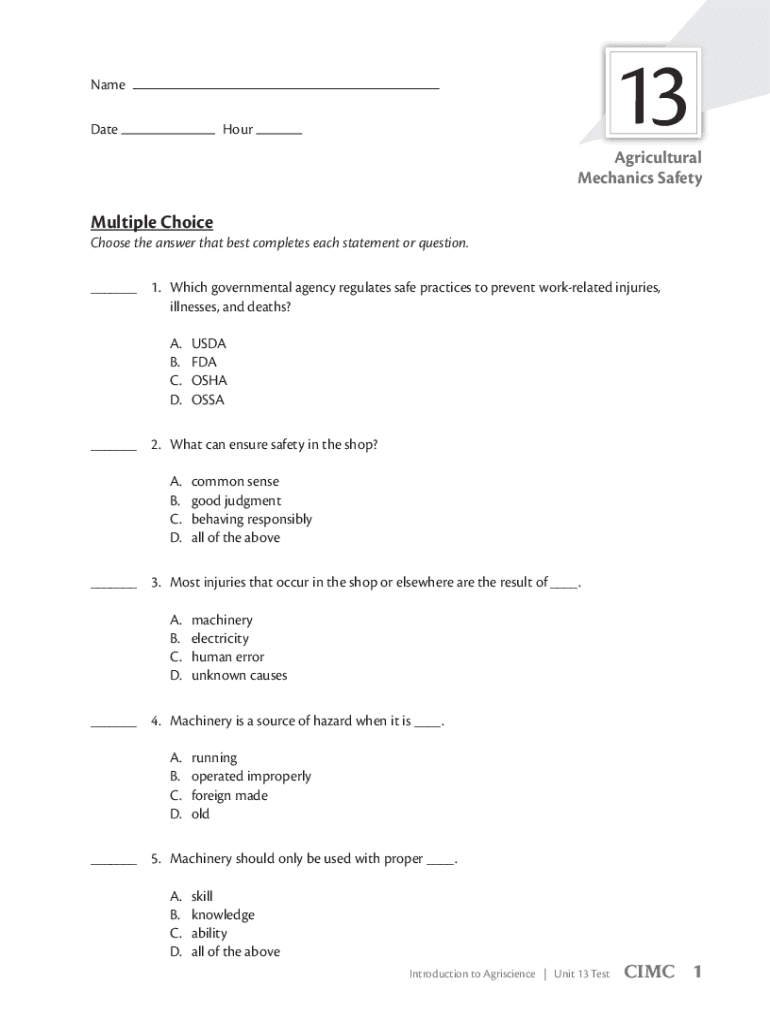 13Name DateHourAgricultural Mechanics SafetyMultiple Choice Choose the answer that best completes each statement or question. ___1. Which governmental agency regulates safe practices to prevent work