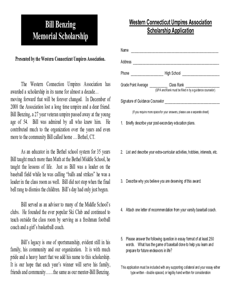 Bill Bending Memorial Scholarship Western Connecticut Umpires Association Scholarship Application Name ___Presented by the Western Connecticut Umpires Association. Address ___ Phone ___ High School