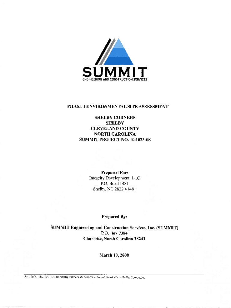 SUMMIT ENGINEERING AND CONSTRUCTION SERVICESPHASE I ENVIRONMENTAL SITE ASSESSMENT SHELBY CORNERS SHELBY CLEVELAND COUNTY NORTH CAROLINA SUMMIT PROJECT NO. EI02308Prepared For: Integrity Development,