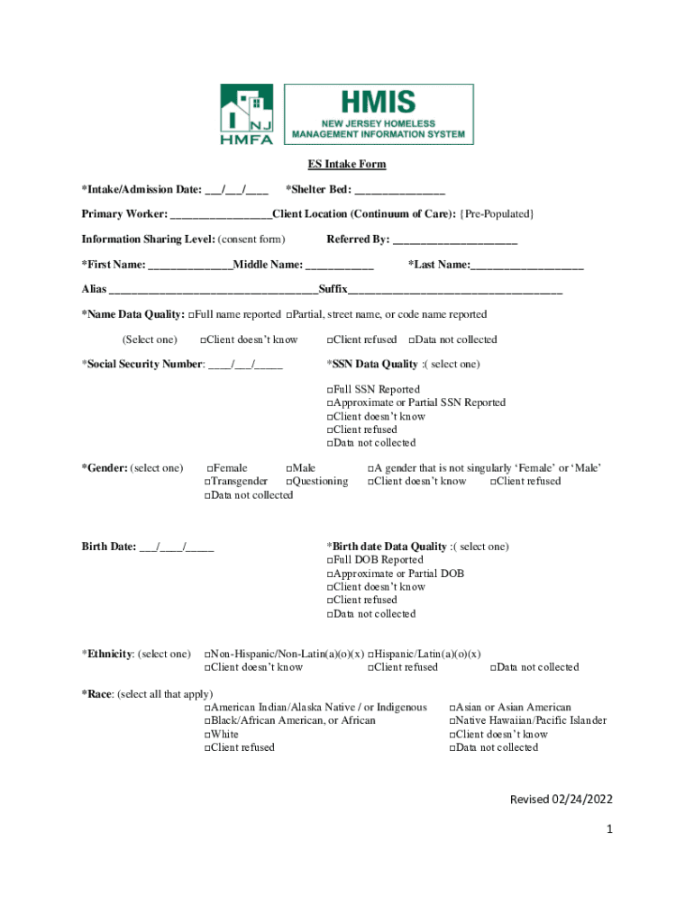 ES Intake Form *Intake/Admission Date: ___/___/___*Shelter Bed: ___Primary Worker: ___Client Location (Continuum of Care): PrePopulated Information Sharing Level: (consent form)Referred By: ___*First
