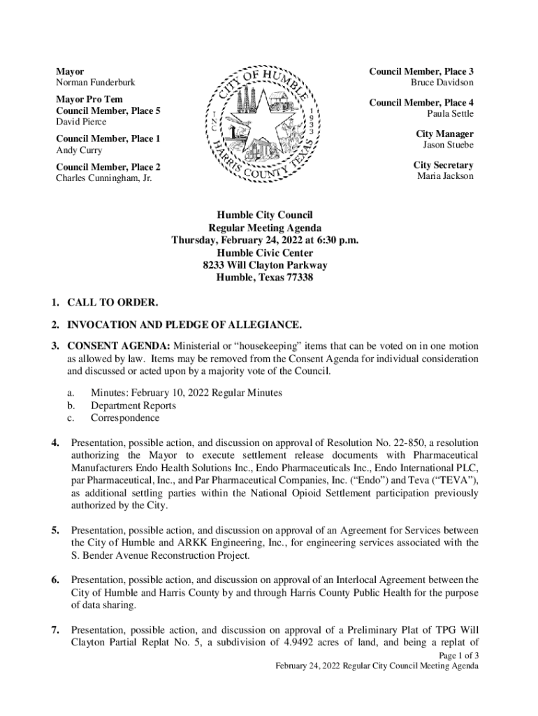 Mayor Norman FunderburkCouncil Member, Place 3 Bruce DavidsonMayor Pro Tem Council Member, Place 5 David PierceCouncil Member, Place 4 Paula Settle City Manager Jason StuebeCouncil Member, Place 1