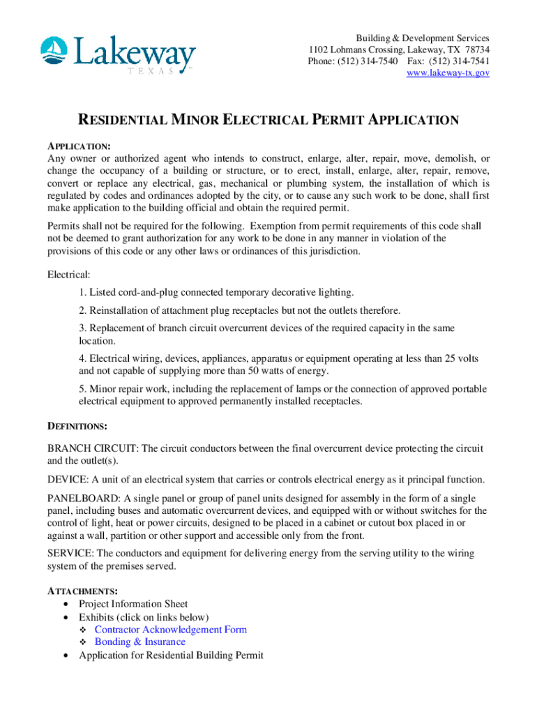 Building & Development Services 1102 Loans Crossing, Lake way, TX 78734 Phone: (512) 3147540 Fax: (512) 3147541 www.lakewaytx.govRESIDENTIAL MINOR ELECTRICAL PERMIT APPLICATION: Any owner or authorized