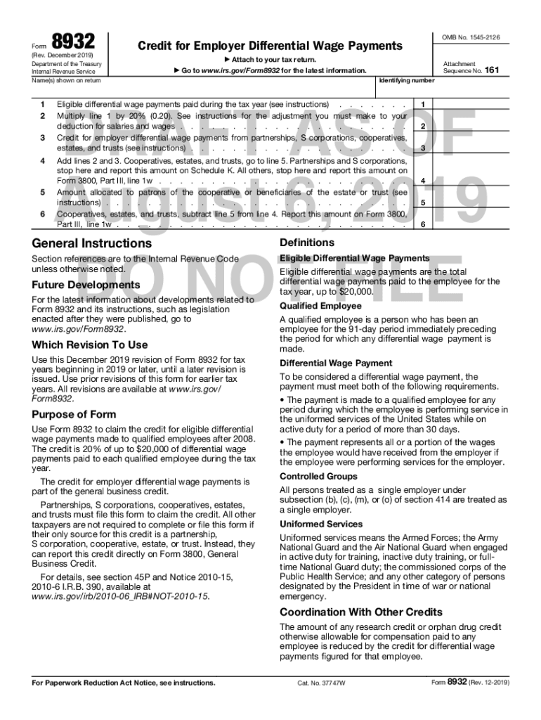Get the free Form 8932 (Rev. December 2019). Credit for Employer Differential Wage Payments