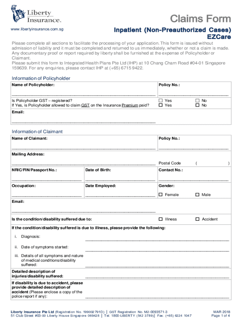 WWW.libertyinsurance.com.please complete all sections to facilitate the processing of your application. This form is issued without admission of liability, and it must be completed and returned to