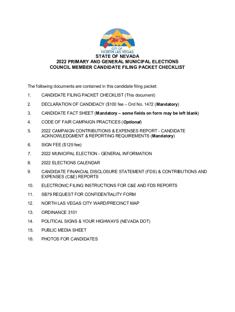 STATE OF NEVADA 2022 PRIMARY AND GENERAL MUNICIPAL ELECTIONS COUNCIL MEMBER CANDIDATE FILING PACKET Checklist following documents are contained in this candidate filing packet: 1.CANDIDATE FILING