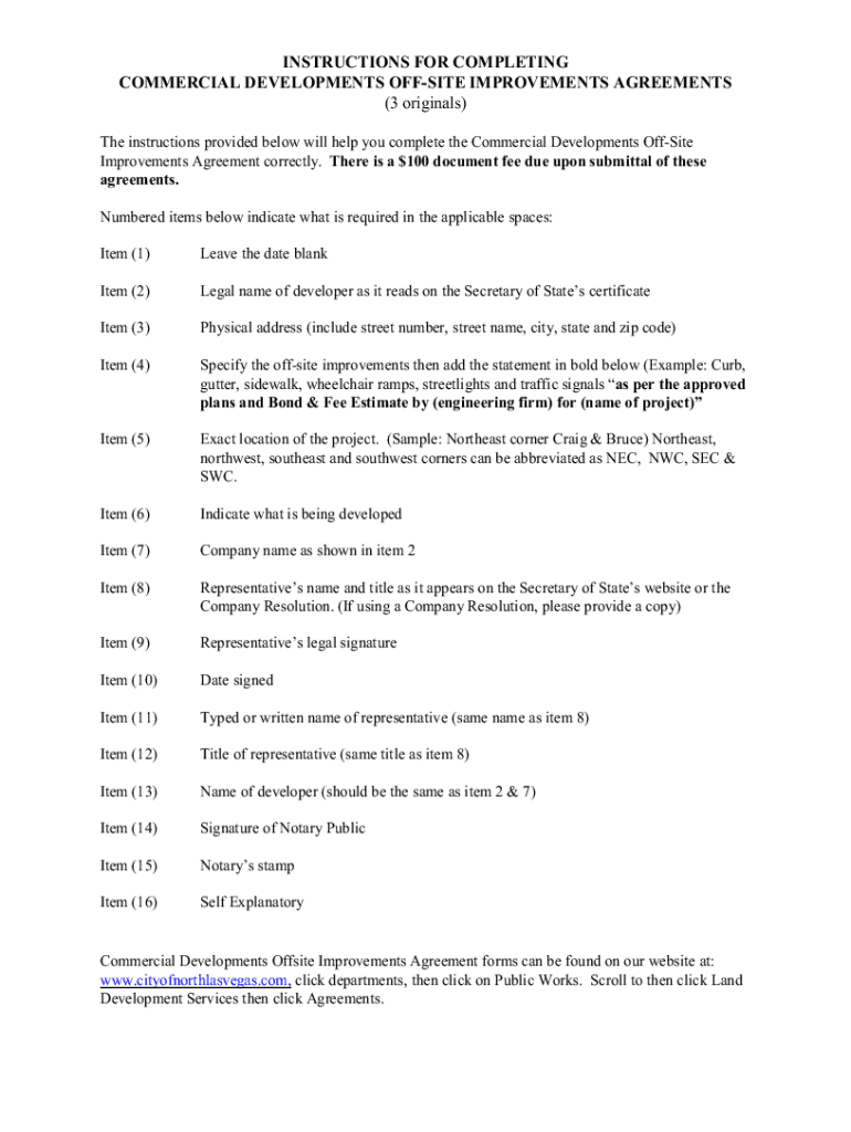 INSTRUCTIONS FOR COMPLETING COMMERCIAL DEVELOPMENTS OFFSITE IMPROVEMENTS AGREEMENTS (3 originals) The instructions provided below will help you complete the Commercial Developments Offsite Improvements