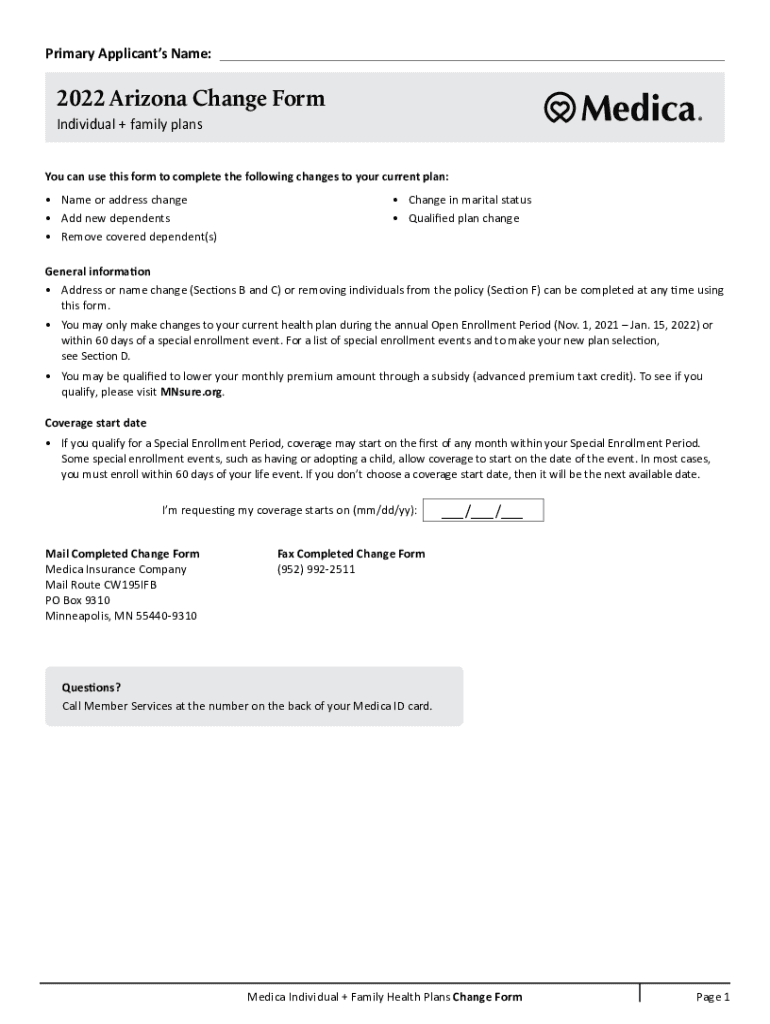 Primary Applicants Name:2022 Arizona Change Form Individual + family plans You can use this form to complete the following changes to your current plan: Name or address change in marital status Add