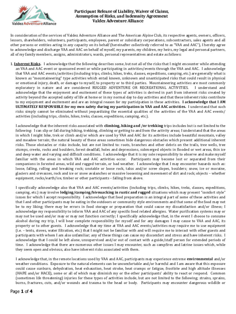 Participant Release of Liability, Waiver of Claims, Assumption of Risks, and Indemnity Agreement Valdez Adventure Alliance In consideration of the services of Valdez Adventure Alliance and The American