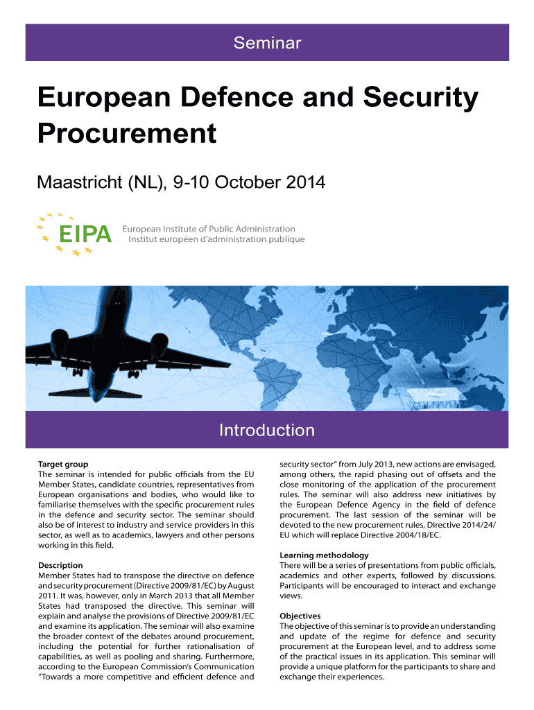 Seminar European Defense and Security Procurement Maastricht (NL), 9-10 October 2014 European Institute of Public Administration Institute euro pen d administration oblique Introduction Target group