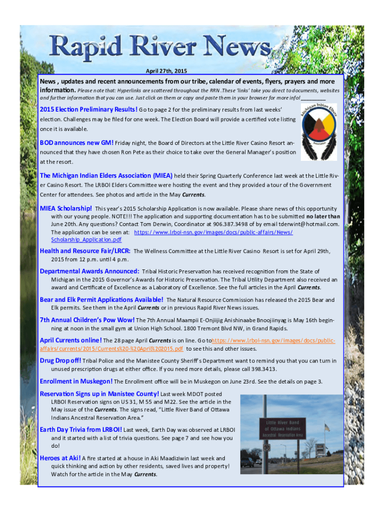 Page 1April 27th, 2015News, updates and recent announcements from our tribe, calendar of events, flyers, prayers and more information. Please note that: Hyperlinks are scattered throughout the RRN.