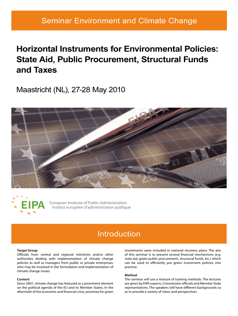 Seminar Environment and Climate Change Horizontal Instruments for Environmental Policies: State Aid, Public Procurement, Structural Funds and Taxes Maastricht (NL), 27-28 May 2010 European Institute