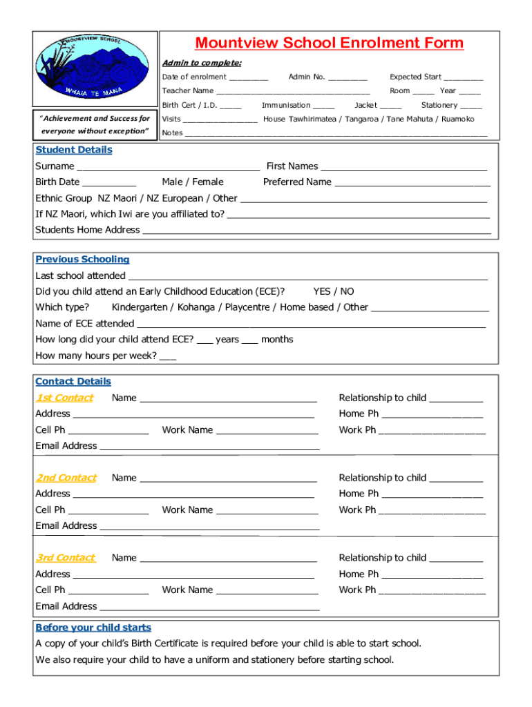 Mount view School Enrollment Form Admin to complete: Date of enrollment ___Admin No. ___Teacher Name ___ Birth Cert / I.D. ___Achievement and Success for everyone without exceptionImmunisation ___Expected
