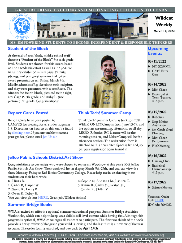 K6: NURTURING, EPCI TING AND MOTIVATING CHILDREN TO LEARNWildcat Weekly March 10, 2022Student of the BlockUpcoming Events:At the end of each block, middle school staff choose a Student of the Block