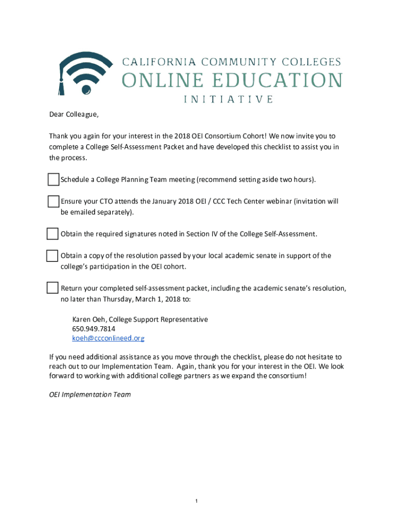 Dear Colleague, Thank you again for your interest in the 2018 WEI Consortium Cohort! We now invite you to complete a College Reassessment Packet and have developed this checklist to assist you in