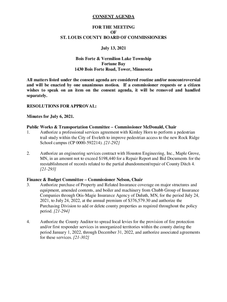 CONSENT AGENDA FOR THE MEETING OF ST. LOUIS COUNTY BOARD OF COMMISSIONERS July 13, 2021, Boys Forte & Vermilion Lake Township Fortune Bay 1430 Boys Forte Road, Tower, Minnesota All matters listed