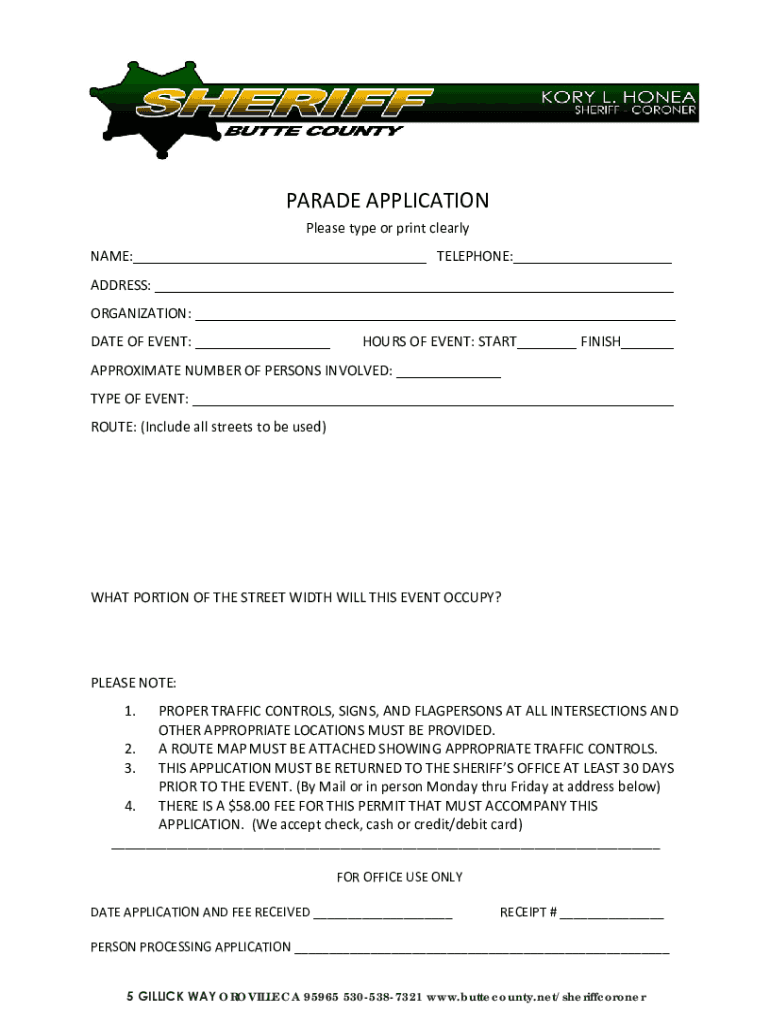 PARADE APPLICATION Please type or print clearly NAME:___ TELEPHONE:___ ADDRESS: ___ ORGANIZATION: ___ DATE OF EVENT: ___HOURS OF EVENT: START___ FINISH___APPROXIMATE NUMBER OF PERSONS INVOLVED: ___