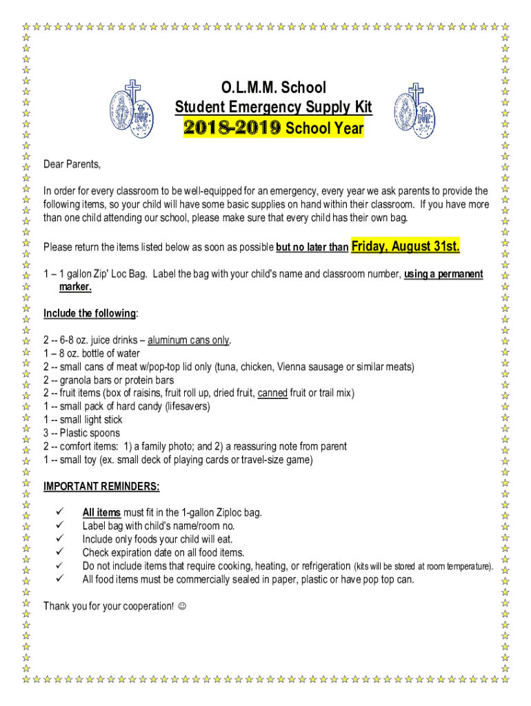 O.L.M.M. School Student Emergency Supply Kit 20182019 School Year Dear Parents, In order for every classroom to be well-equipped for an emergency, every year we ask parents to provide the following