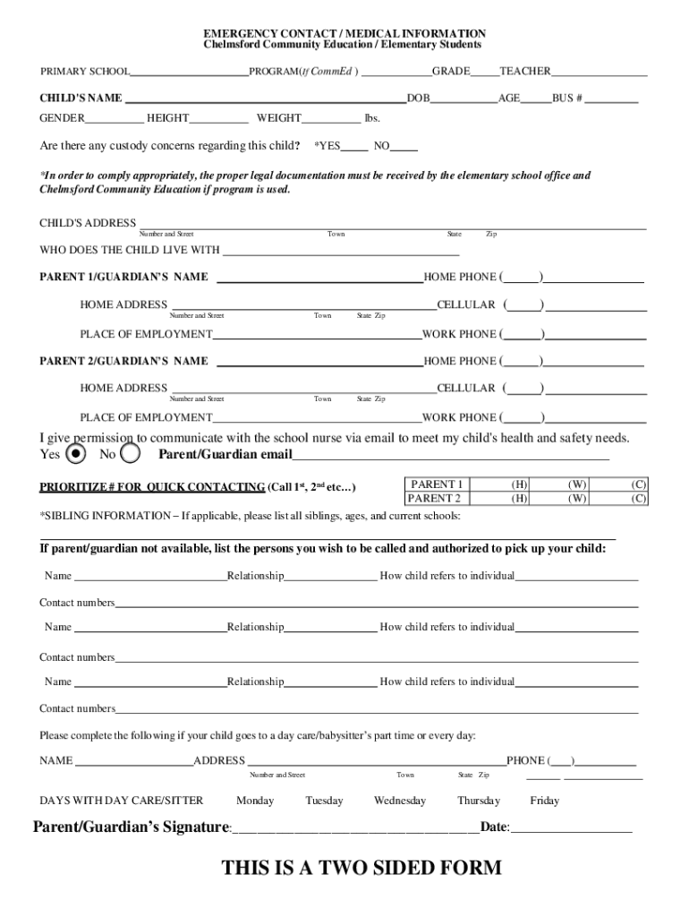 EMERGENCY CONTACT / MEDICAL INFORMATION Chelmsford Community Education / Elementary Students PROGRAM(If Combed)PRIMARY SCHOOLGRADECHILD\'S NAME GENDERTEACHER×DOB HEIGHTWEIGHTAre there any custody