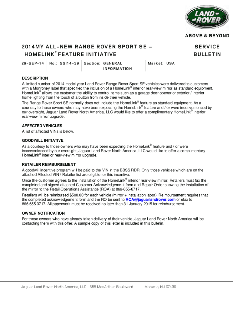 2014MY ALLOW RANGE ROVER SPORT SE HOMELAND FEATURE INITIATIVE 26SEP14No.: SGI1439Section: GENERAL INFORMATIONSERVICE BULLETINMarket: DESCRIPTION A limited number of 2014 model year Land Rover Range