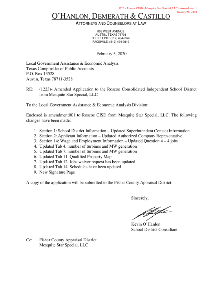 1223 Roscoe CSD Mesquite Star Special, LLC Amendment 1 January 28, 2020OHANLON, DEMERIT & CASTILLO ATTORNEYS AND COUNSELORS AT LAW 808 WEST AVENUE AUSTIN, TEXAS 78701 TELEPHONE: (512) 4949949 FACSIMILE: