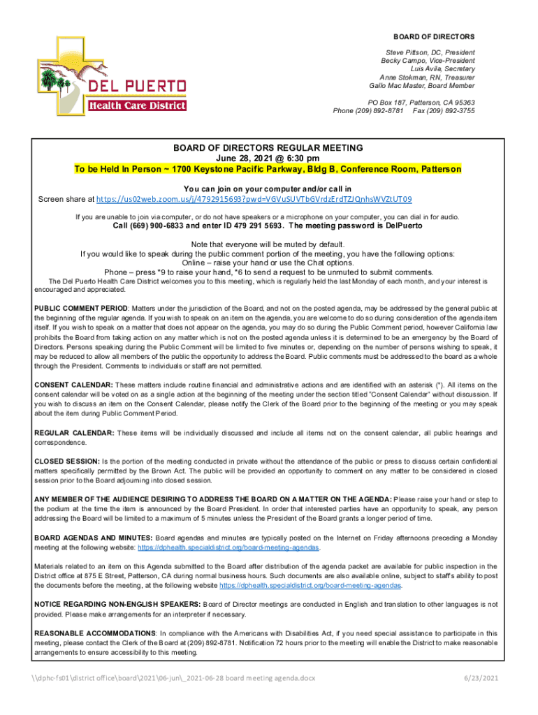BOARD OF DIRECTORS Steve Pitt son, DC, President Becky Camp, VicePresident Luis Avila, Secretary Anne Stockman, RN, Treasurer Gallo Mac Master, Board Member PO Box 187, Patterson, CA 95363 Phone (209)