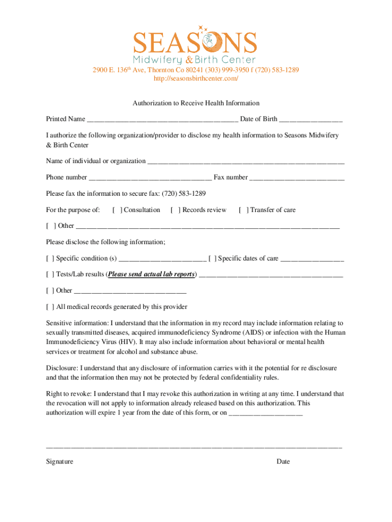 2900 E. 136th Ave, Thornton Co 80241 (303) 9993950 f (720) 5831289 http://seasonsbirthcenter.com/ Authorization to Receive Health Information Printed Name ___ Date of Birth ___ I authorize the following