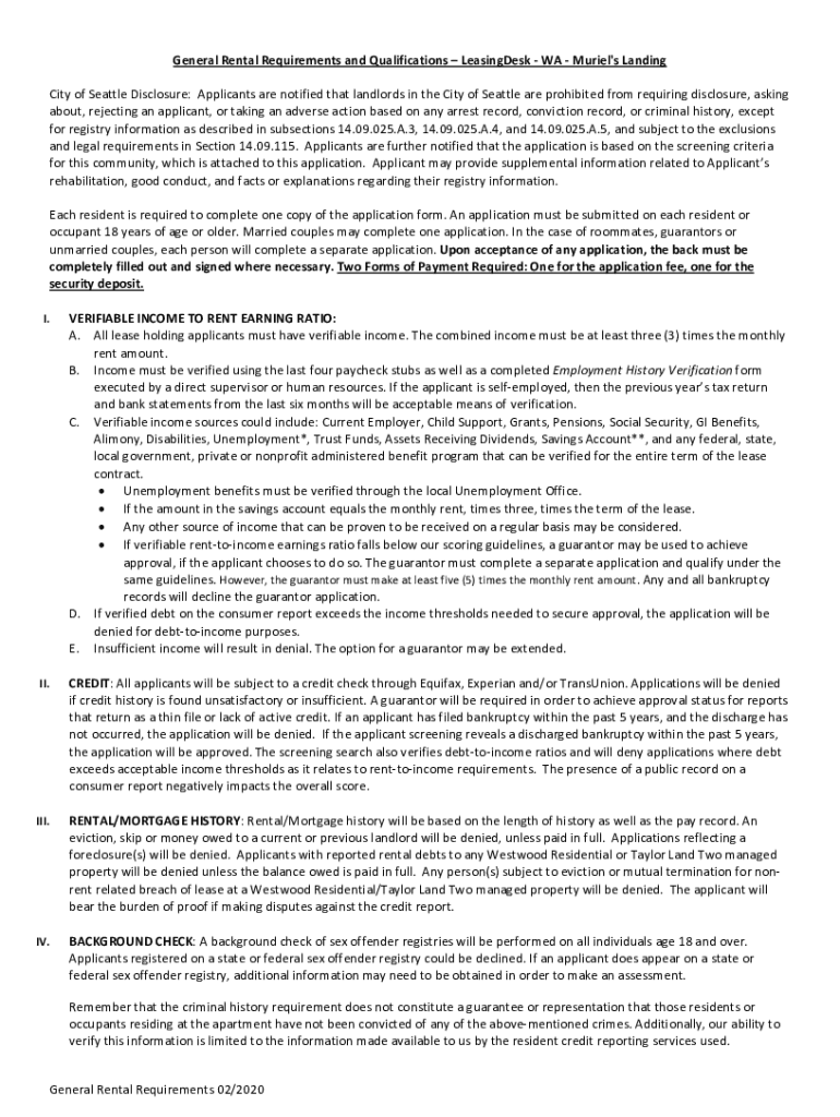 General Rental Requirements and Qualifications LeasingDesk WA Muriel\'s Landing City of Seattle Disclosure: Applicants are notified that landlords in the City of Seattle are prohibited from requiring