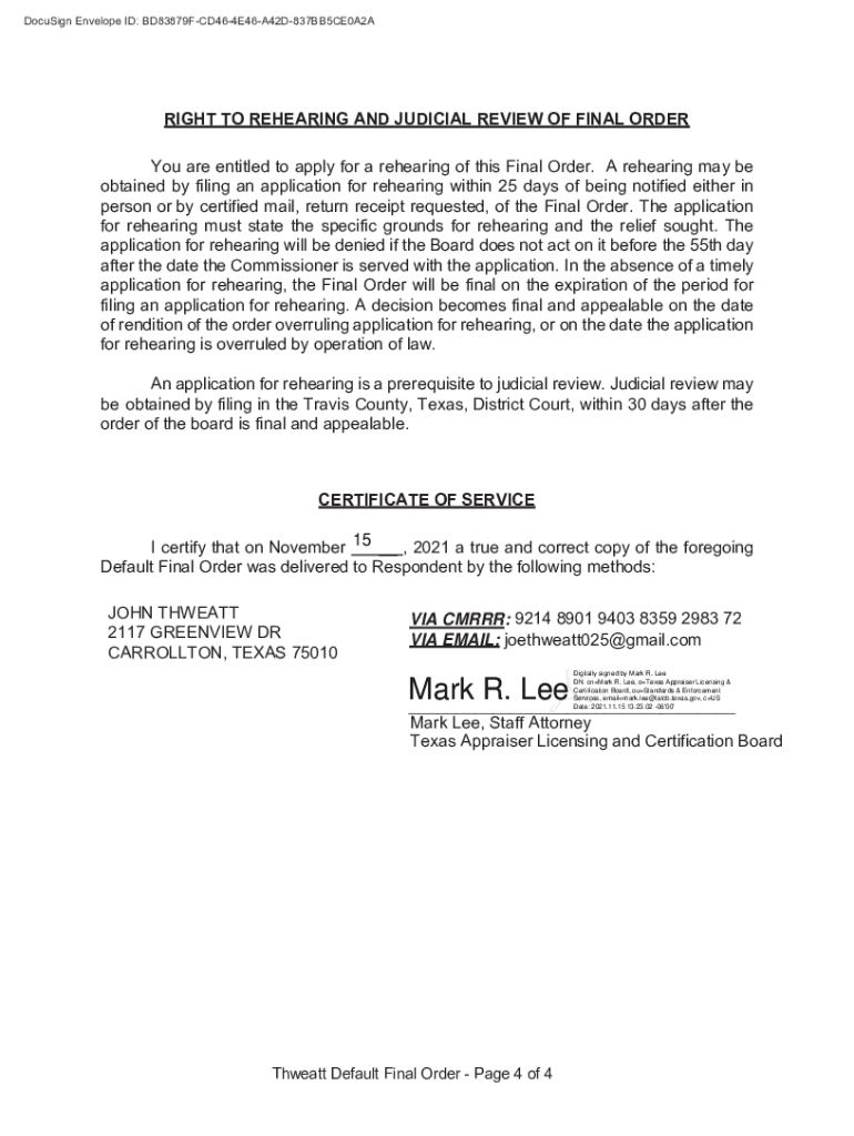TEXAS APPRAISER LICENSING AND CERTIFICATION BOARD vs. JOHN THREAT TX1336116R COMPLAINT CASE NUMBER 21232DEFAULT FINAL ORDER On this ___ day of ___, 2021, the Texas Appraiser Licensing and Certification
