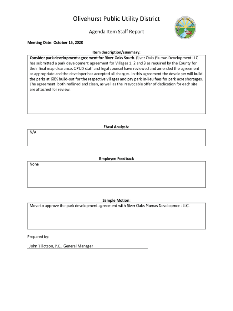 Liverwurst Public Utility District Agenda Item Staff Report Meeting Date: October 15, 2020, Item description/summary: Consider park development agreement for River Oaks South. River Oaks Plumes Development
