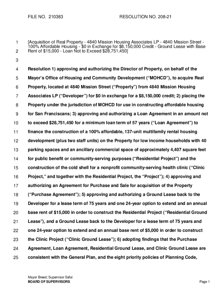 FILE NO. 2103831 2RESOLUTION NO. 20821×Acquisition of Real Property 4840 Mission Housing Associates LP 4840 Mission Street 100% Affordable Housing $0 in Exchange for $8,150,000 Credit Ground Leases