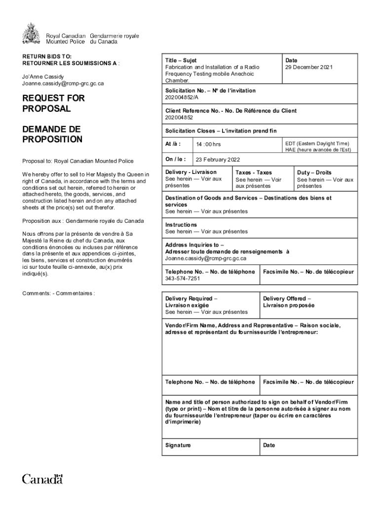 RETURN BIDS TO: RETURNER LES COMMISSIONS A : Joanne Cassidy Joanne. Cassidy×RCMP.GC.request FOR PROPOSAL DEMAND DE PROPOSITIONSolicitation No. N de invitation 202004852/A Client Reference No. No.
