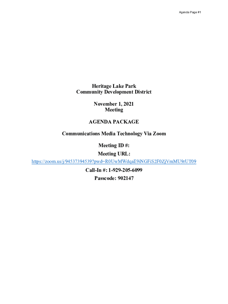 Agenda Page #1Heritage Lake Park Community Development District November 1, 2021, Meeting AGENDA PACKAGE Communications Media Technology Via Zoom Meeting ID #: Meeting URL: https://zoom.us/j/94537394539?pwdR0UwMWdqaE9iNGFiS2F0ZjVmMU9rUT09CallIn