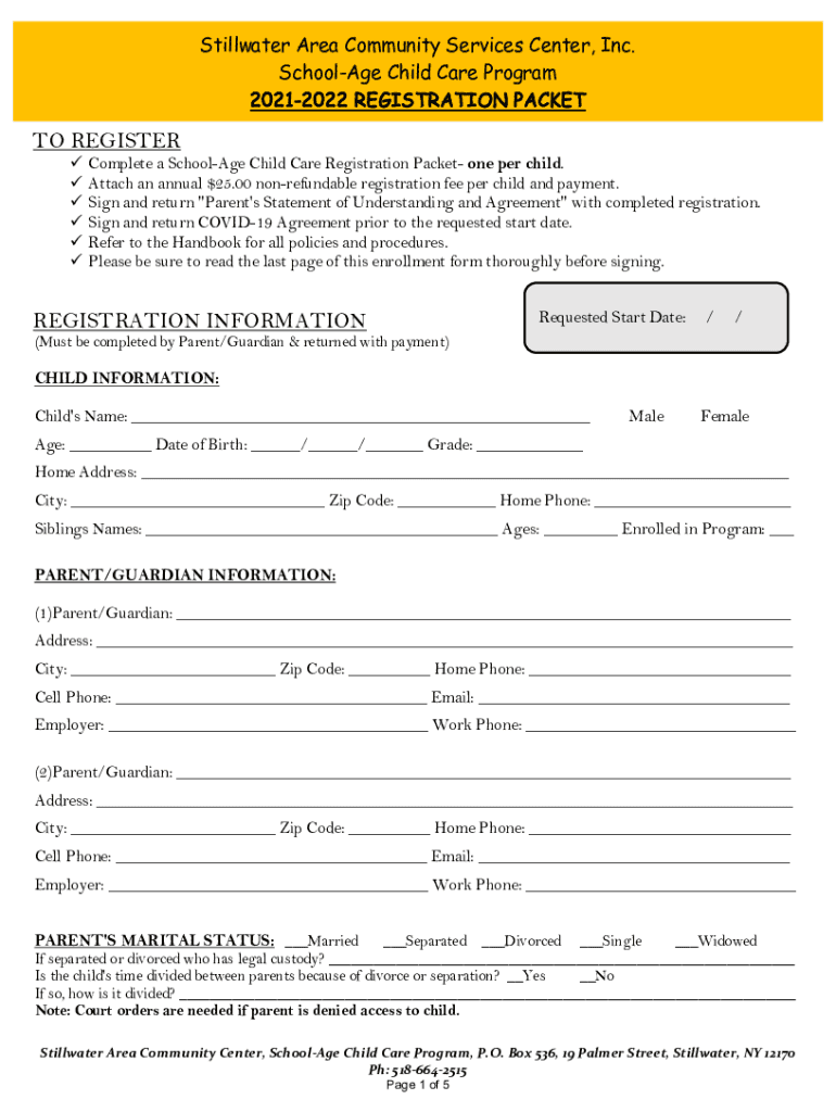 Stillwater Area Community Services Center, Inc. Schoolmate Child Care Program 20212022 REGISTRATION PACKET TO REGISTER Complete a Schoolmate Child Care Registration Packet one per child. Attach an