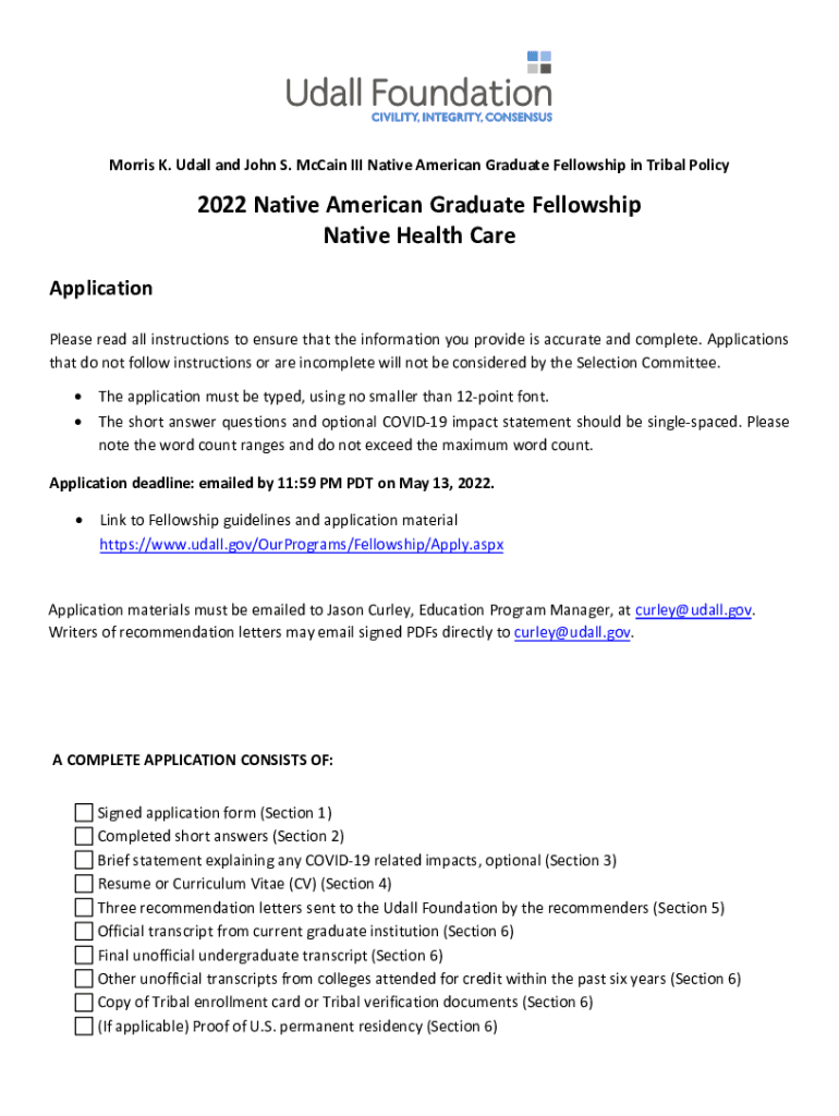 Morris K. Udall and John S. McCain III Native American Graduate Fellowship in Tribal Policy2022 Native American Graduate Fellowship Native Health Care Application Please read all instructions to ensure