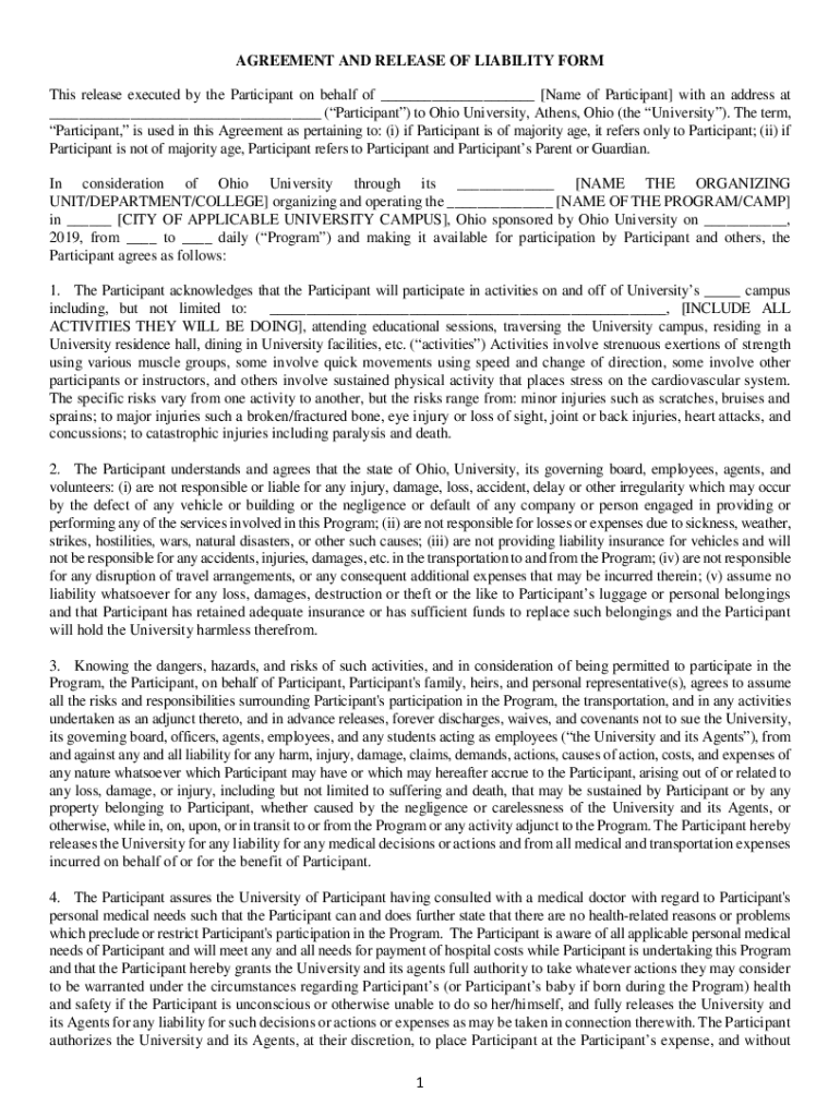 AGREEMENT AND RELEASE OF LIABILITY FORM This release executed by the Participant on behalf of ___ [Name of Participant] with an address at ___ (Participant) to Ohio University, Athens, Ohio (the University).