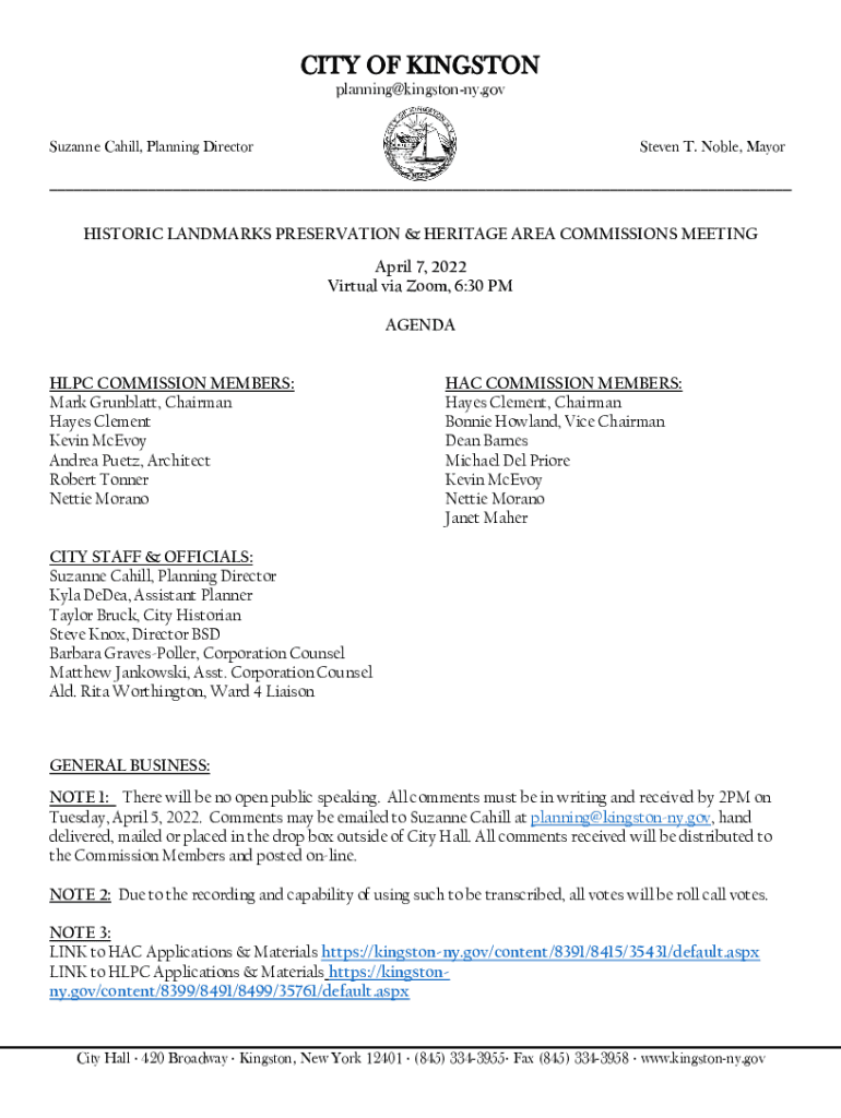 CITY OF KINGSTON planning×Kingston.gov Suzanne Cahill, Planning Director Steven T. Noble, Mayor___ HISTORIC LANDMARKS PRESERVATION & HERITAGE AREA COMMISSIONS MEETING April 7, 2022, Virtual via Zoom,