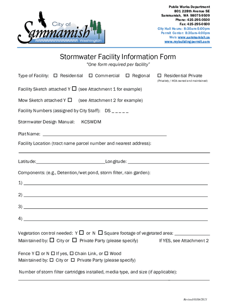 Public Works Department 801 228th Avenue SE Sammamish, WA 980759509 Phone: 4252950500 Fax: 4252950600 City Hall Hours: 8:30am5:00pm Permit Center: 8:30am4:00pm Web: www.sammamish.us www.mybuildingpermit.comStormwater