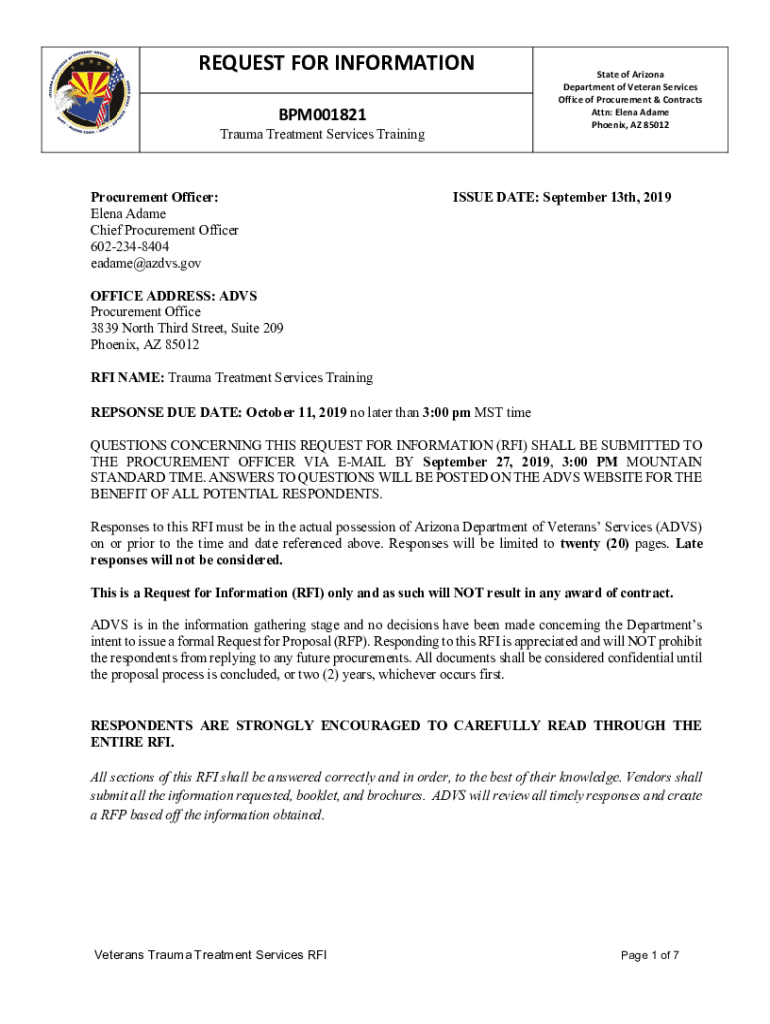REQUEST FOR INFORMATION BPM001821Trauma Treatment Services TrainingProcurement Officer: Elena Adam Chief Procurement Officer 6022348404 madame×AIDS.gestate of Arizona Department of Veteran Services