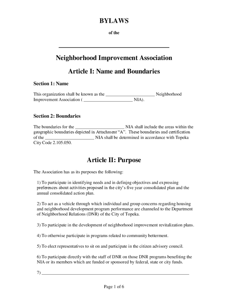 BYLAWS of the___ Neighborhood Improvement Association Article I: Name and Boundaries Section 1: Name This organization shall be known as the ___ Neighborhood Improvement Association (___ NIA). Section