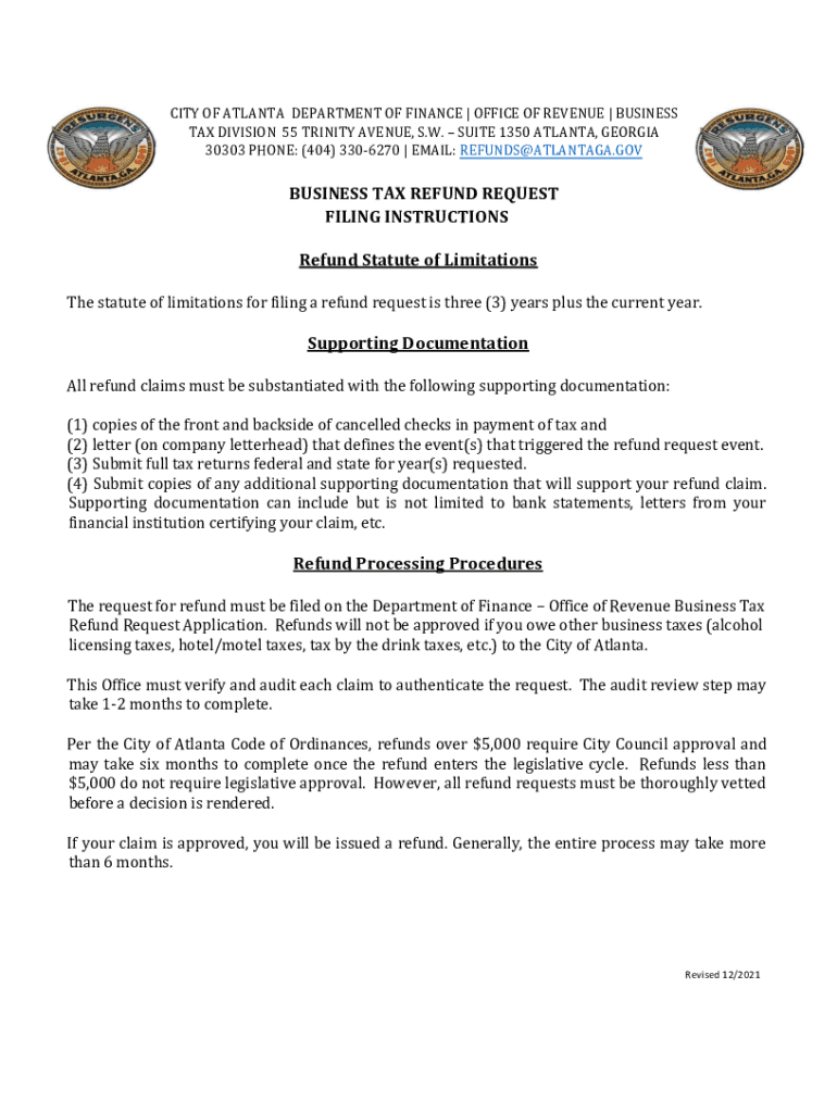 CITY OF ATLANTA DEPARTMENT OF FINANCE | OFFICE OF REVENUE | BUSINESS TAX DIVISION 55 TRINITY AVENUE, S.W. SUITE 1350 ATLANTA, GEORGIA 30303 PHONE: (404) 3306270 | EMAIL: REFUNDS×ATLANTA.BUSINESS
