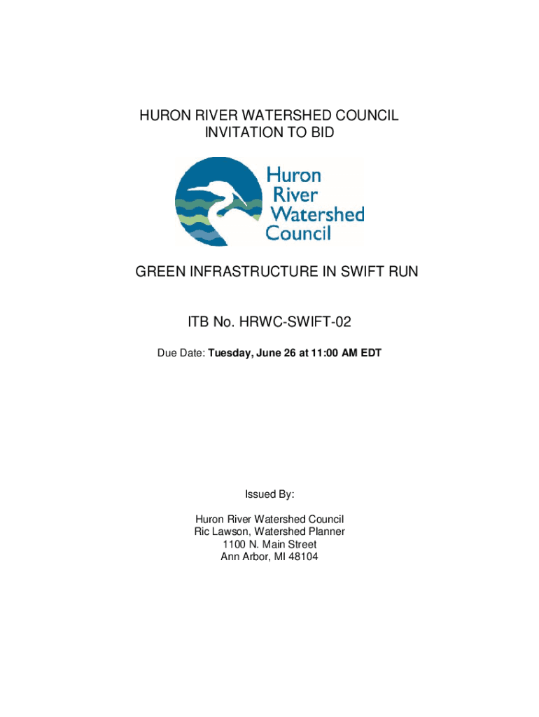 HURON RIVER WATERSHED COUNCIL INVITATION TO GREEN INFRASTRUCTURE IN SWIFT RUN ITB No. HRWCSWIFT02 Due Date: Tuesday, June 26 at 11:00 AM Issued By: Huron River Watershed Council RIC Lawson, Watershed