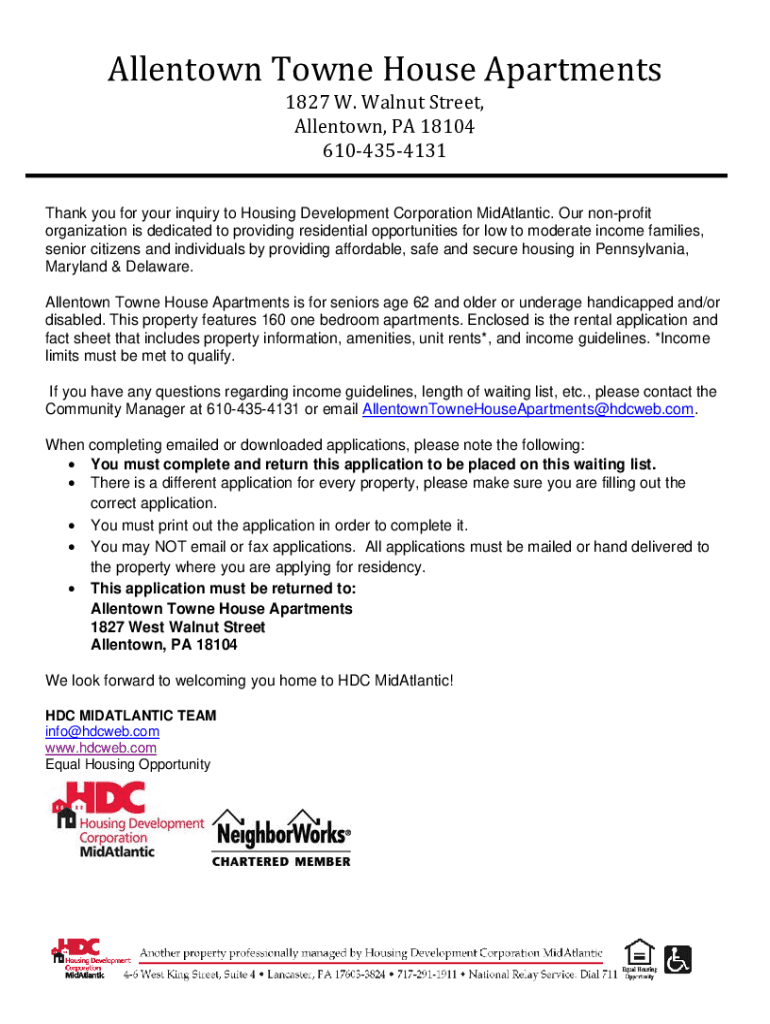 Allentown Town House Apartments 1827 W. Walnut Street, Allentown, PA 18104 6104354131Thank you for your inquiry to Housing Development Corporation mid-Atlantic. Our nonprofit organization is dedicated