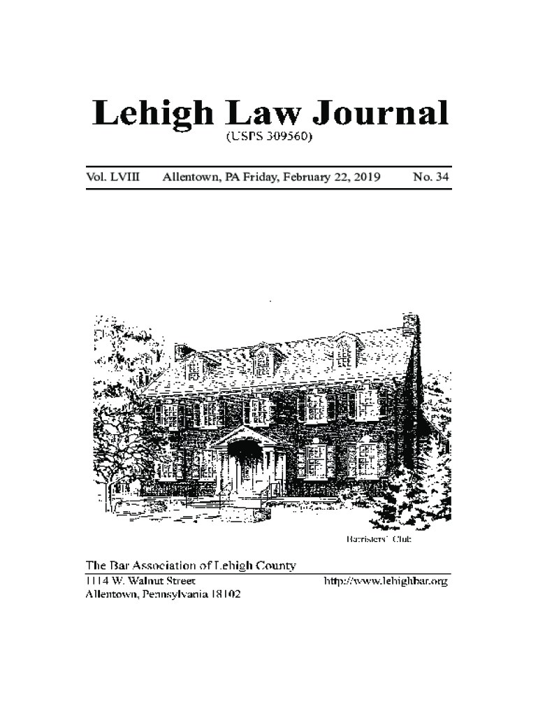 Vol. LVIIIAllentown, PA Friday, February 22, 2019No. 34THE COURT The Hon. Edward D. Rahman, President Judge The Hon. Robert L. Steinberg, Judge The Hon. J. Brian Johnson, Judge The Hon. Kelly L. Banach,