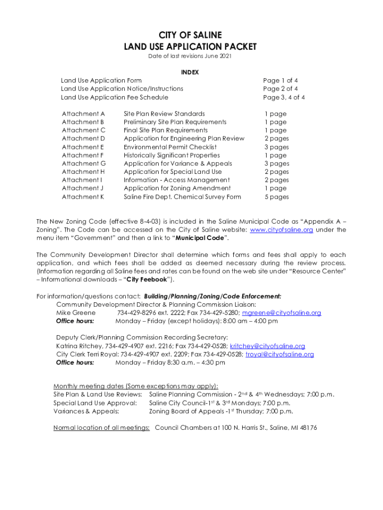 CITY OF SALINE LAND USE APPLICATION PACKET Date of last revisions June 2021INDEX Land Use Application Form Land Use Application Notice/Instructions Land Use Application Fee Schedule Page 1 of 4-Page