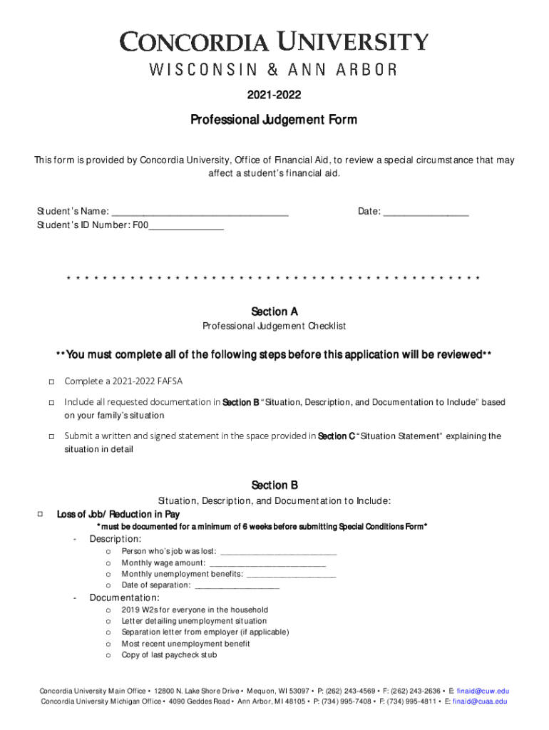 20212022Professional Judgement Form This form is provided by Concordia University, Office of Financial Aid, to review a special circumstance that may affect a students financial aid. Students Name: