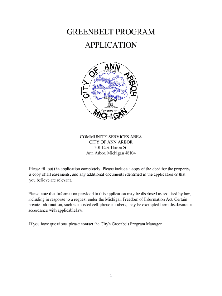 GREENBELT PROGRAM APPLICATIONCOMMUNITY SERVICES AREA CITY OF ANN ARBOR 301 East Huron St. Ann Arbor, Michigan 48104Please fill out the application completely. Please include a copy of the deed for