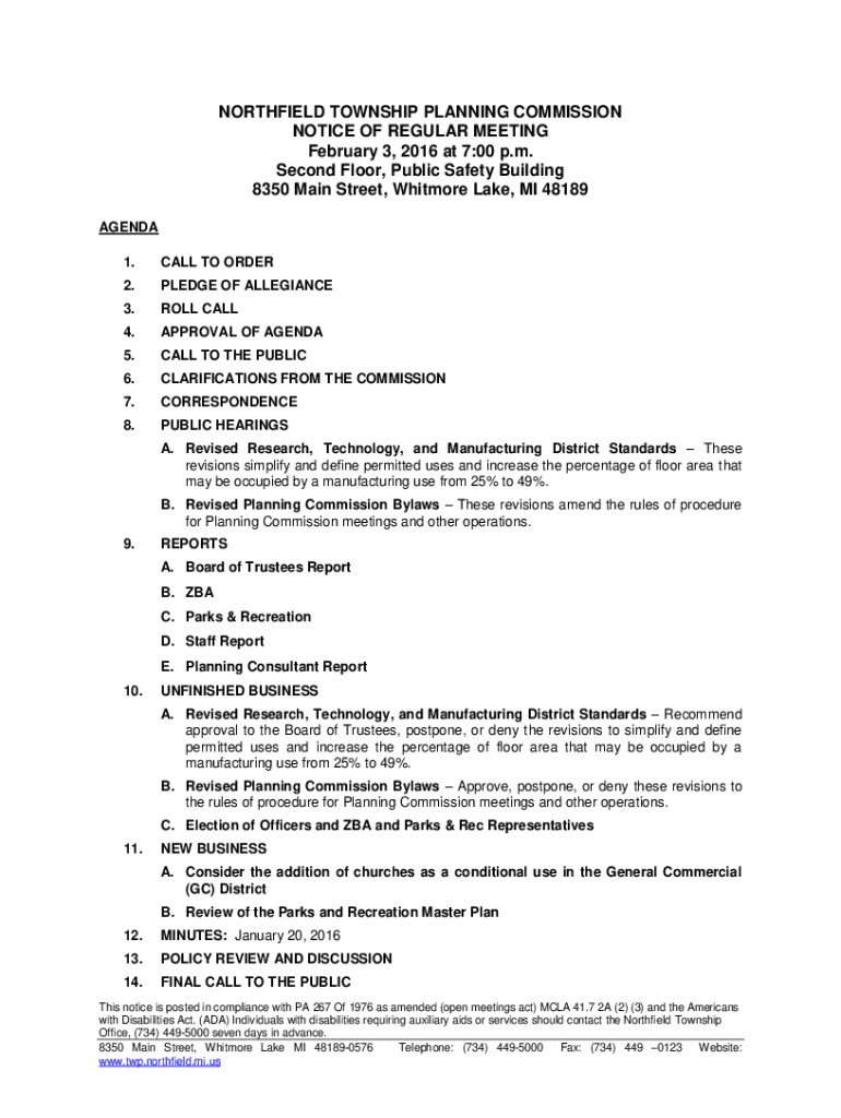 NORTHFIELD TOWNSHIP PLANNING COMMISSION NOTICE OF REGULAR MEETING February 3, 2016, at 7:00 p.m. Second Floor, Public Safety Building 8350 Main Street, Whitmore Lake, MI 48189 AGENDA 1.CALL TO ORDER2.PLEDGE