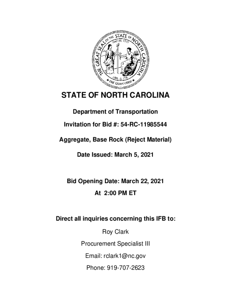 STATE OF NORTH CAROLINA Department of Transportation Invitation for Bid #: 54RC11985544 Aggregate, Base Rock (Reject Material) Date Issued: March 5, 2021Bid Opening Date: March 22, 2021, At 2:00 PM