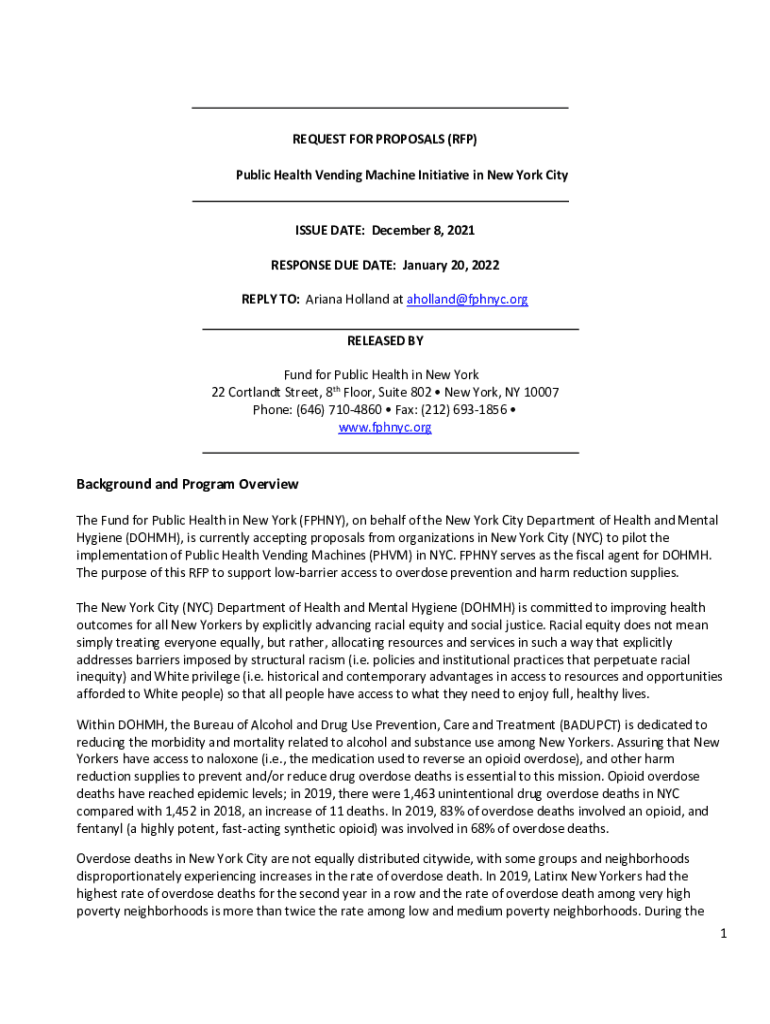 REQUEST FOR PROPOSALS (RFP) Public Health Vending Machine Initiative in New York Tissue DATE: December 8, 2021, RESPONSE DUE DATE: January 20, 2022, REPLY TO: Ariana Holland at Holland×Pfc.org RELEASED